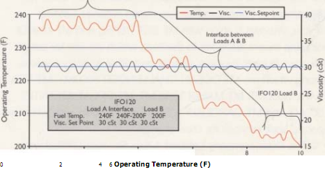 理解為什么混合物粘度有所不同負荷負荷只有一塊拼圖。結(jié)果如何理解不同的粘度是另一回事。不同等級的船用重油當形式層儲存在相同的儲油罐。作為一個結(jié)果,以維持粘度設(shè)置點、燃油的燃燒控制系統(tǒng)必須應(yīng)對急劇變化時對燃油粘度變化之間的接口的掩體滿足燃油駁運泵抽吸。(見圖查看插入的一個例子IF0120不同負荷)。圖說明了一個相當大的變化IF0120粘度的層之間所負荷圖作為°和°B。這需要改變粘度降低燃料溫度從240°F到200°F為了保持粘度設(shè)置點上30 cst。認為會發(fā)生什么事假如操作者僅靠一個理論溫度設(shè)置點來自典型的燃料燃燒曲線。小費會犯規(guī)燃燒器更加頻繁的排放會受到不良影響。