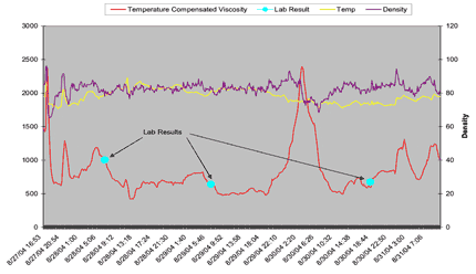 巴西的Petrobras公司進(jìn)行了實(shí)地試驗(yàn),跟蹤運(yùn)動(dòng)學(xué)粘度(即組合測(cè)量絕對(duì)粘度和密度)和溫度。結(jié)果讓人印象深刻, 第一次該公司可以很容易的看到在他們的過(guò)程中發(fā)生了什么。