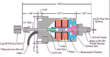 SPL440型探頭安裝在高壓泵經(jīng)過(guò)的系統(tǒng)。兩端都有HIP HF4型接頭配合一個(gè)9/16-28的螺紋使用。SPL440型探頭可以連續(xù)使用壓力高達(dá)20000PSI ,靜止測(cè)量可達(dá)30000PSI .