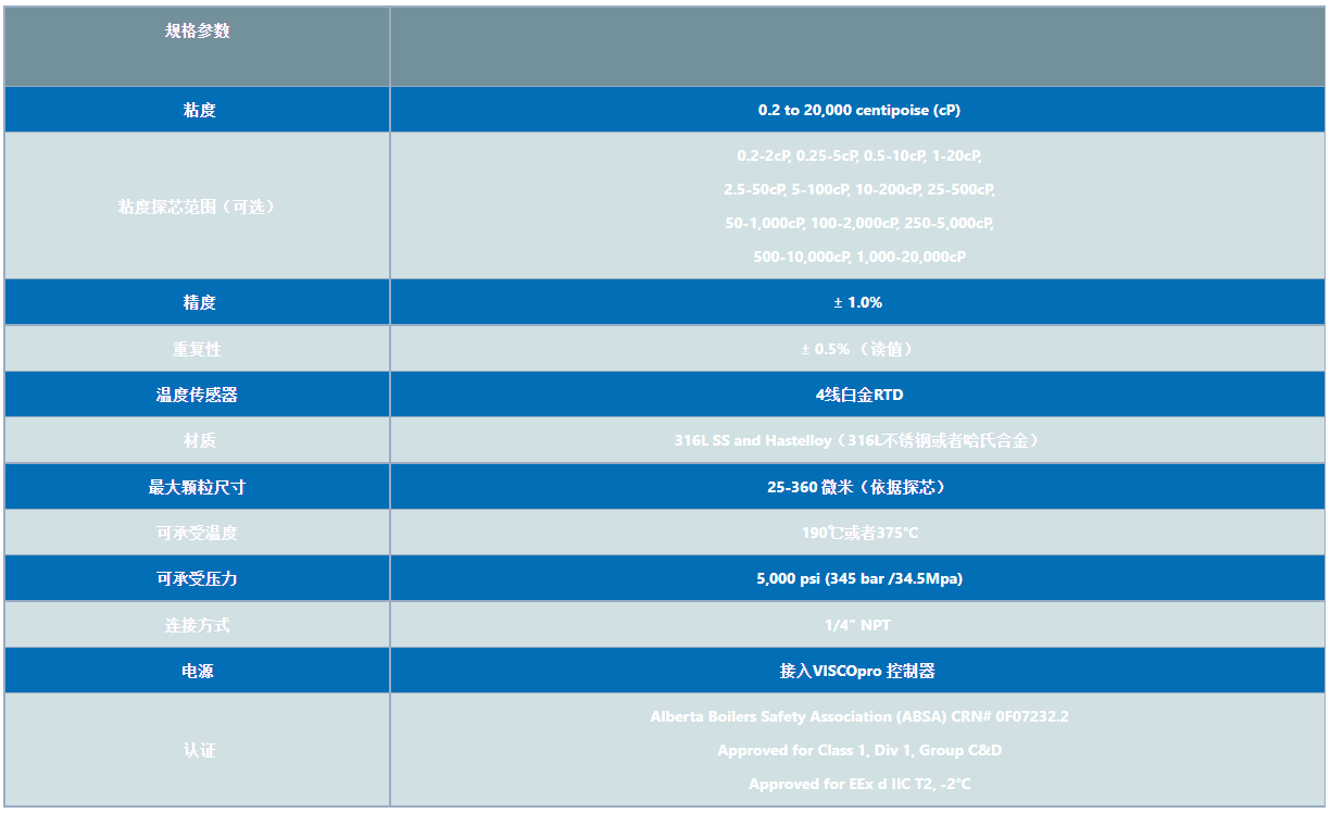 能夠在0.2-20000CP或等量CST的粘度范圍內(nèi),進行13種不同粘度范圍的測量。 探頭頭部的最大流速為10英尺/秒(3米/秒)。